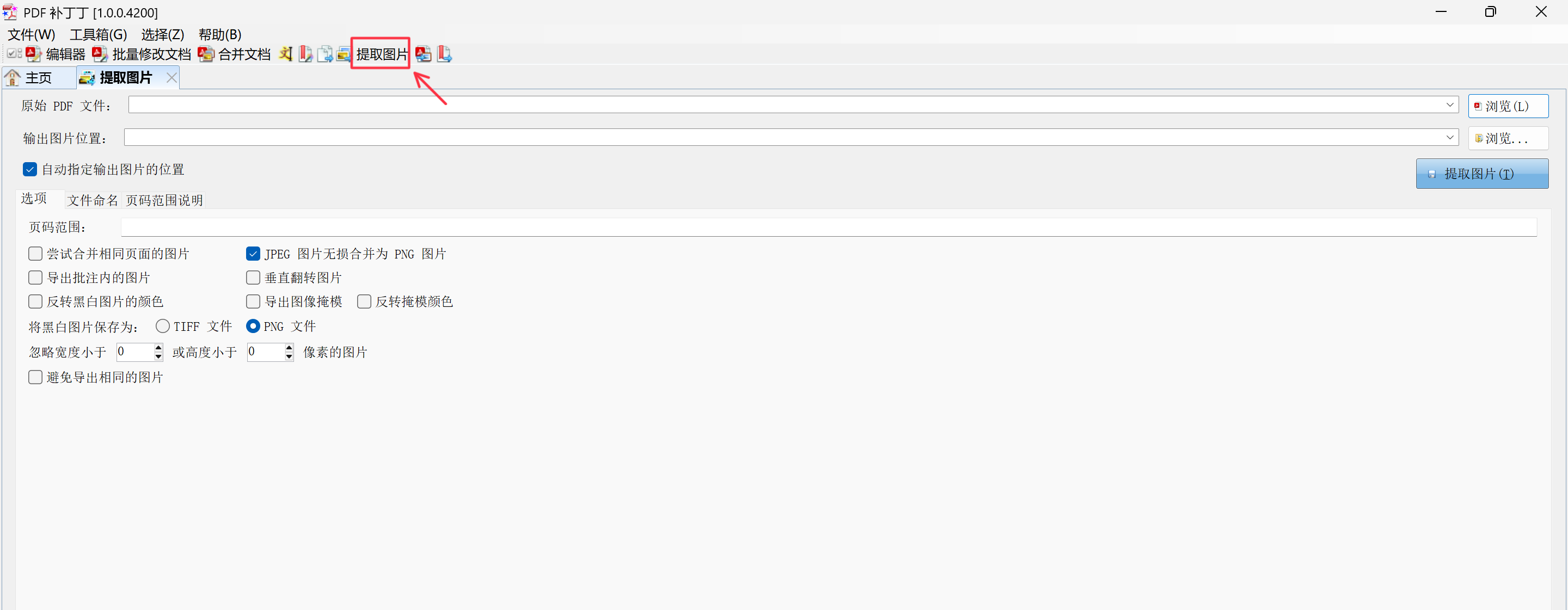 在主界面的选项卡区域,找到并点击 【提取图片】 标签页。点击后,界面将切换到图片提取的专用操作面板。这里提供了提取图片所需的所有设置选项。